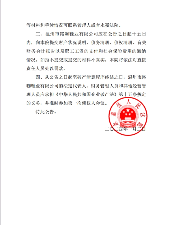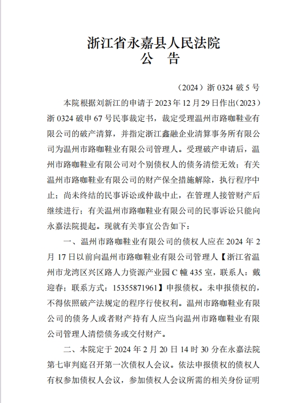 溫州市路咖鞋業有 限公司破產清算公告