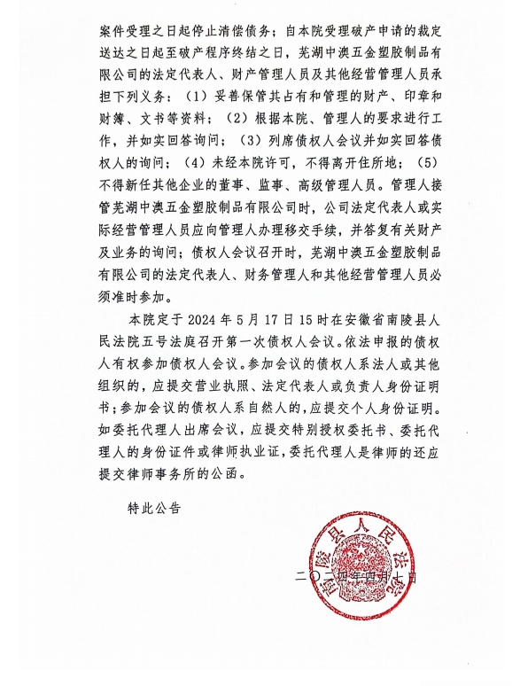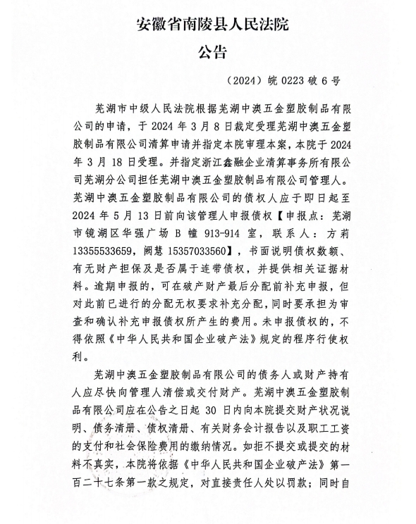 蕪湖中澳五金塑膠制品有限公司破產清算案公告